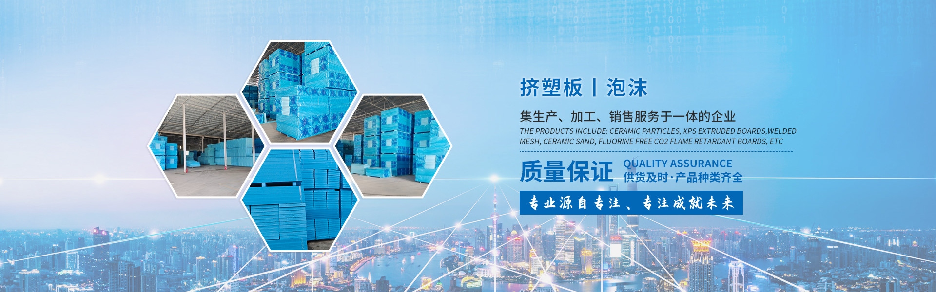 產(chǎn)品有:陶粒、XPS擠塑板、陶砂、無氟co2阻燃板、擠塑復合板。配送材料有:碰焊網(wǎng)、專用膠水、泡沫板、巖棉板、玻璃棉氈、珍珠巖、聚酯無紡布、纖維網(wǎng)格布等。